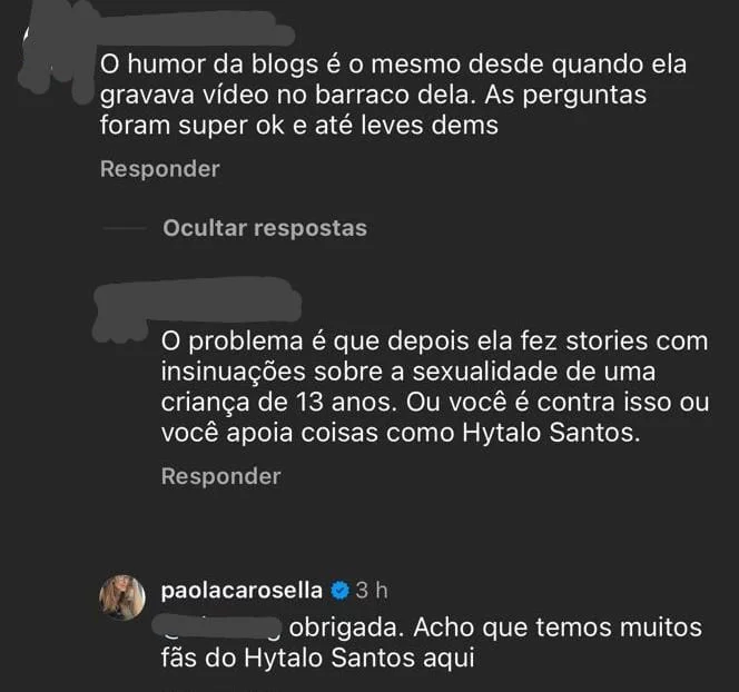 A reação não demorou. Paola confirmou que o unfollow e a exclusão dos vídeos foram diretamente motivados pelo story, e curtiu comentários que pediam proteção à privacidade da filha. Em interações com seguidores, deixou claro que o desconforto não tinha relação com a entrevista, mas com a fala feita depois. Um dos comentários curtidos pela chef sintetizou a posição dela: “Não existe humor quando se mexe com uma menina de 13 anos, ainda mais nas entrelinhas. Você agiu muito bem, Paola.”